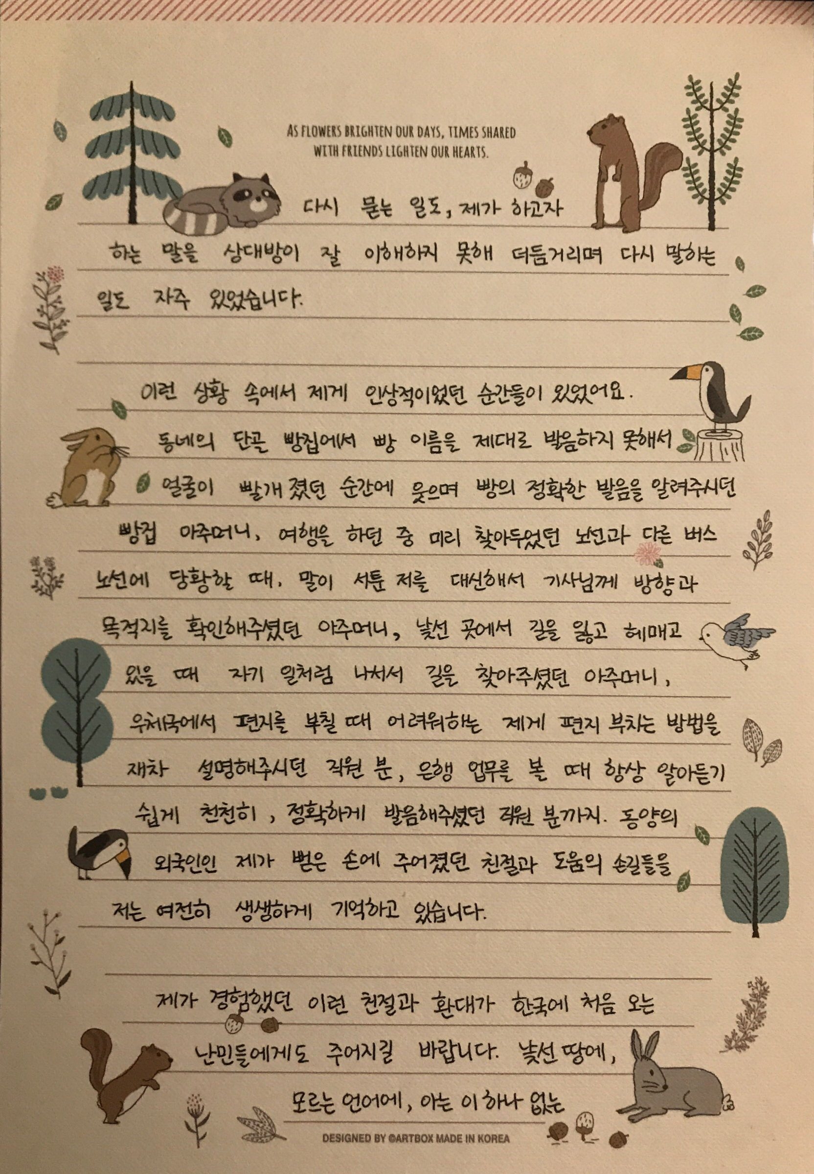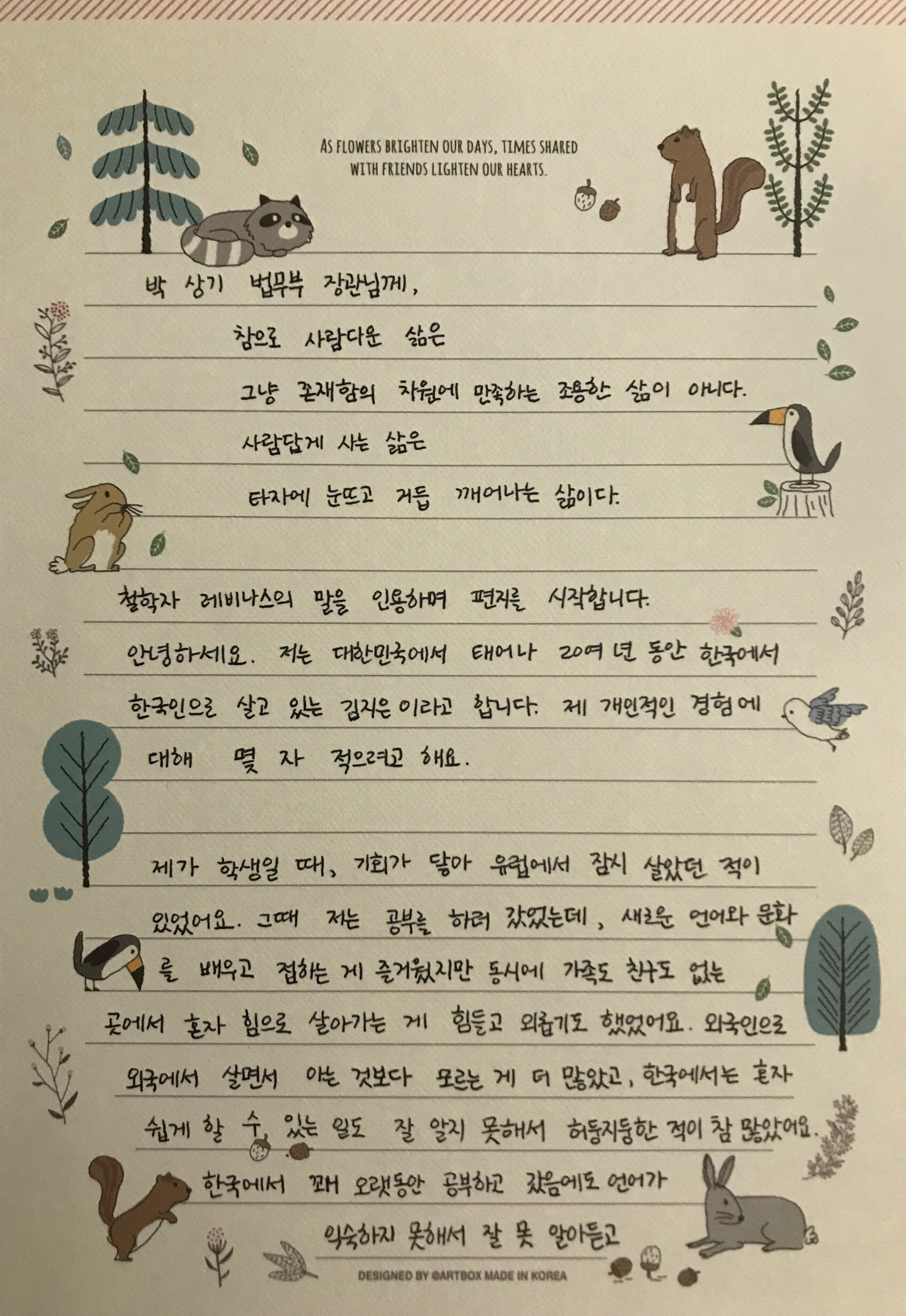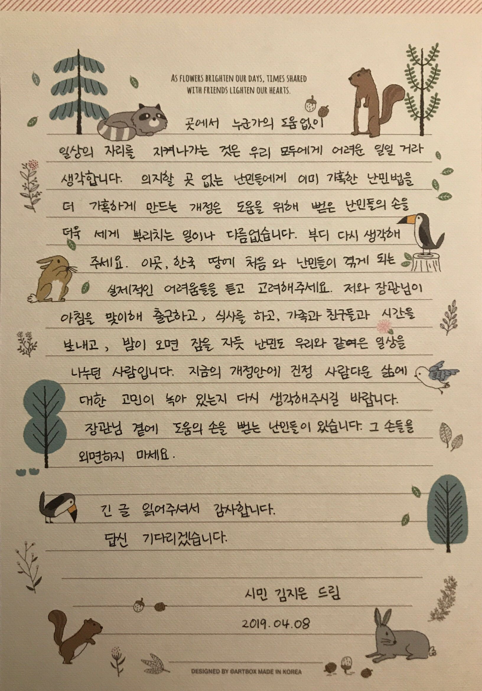 제가 경험했던 이런 친절과 환대가 한국에 처음 오는 난민들에게도 주어지길 바랍니다. 낯선 땅에, 모르는 언어에, 아는 이 하나 없는 곳에서 누군가의 도움 없이 일상의 자리를 지켜나가는 것은 우리 모두에게 어려운 일일 거라 생각합니다. 의지할 곳 없는 난민들에게 이미 가혹한 난민법을 더 가혹하게 만드는 개정은 도움을 위해 뻗은 난민들의 손을 더욱 세게 뿌리치는 일이나 다름없습니다. 부디 다시 생각해주세요. 이곳, 한국 땅에 처음 와 난민들이 겪게 되는 실제적인 어려움들을 듣고 고려해주세요. 저와 장관님이 아침을 맞이해 출근하고, 식사를 하고, 가족과 친구들과 시간을 보내고, 밤이 오면 잠을 자듯 난민도 우리와 같은 일상을 나누던 사람입니다. 지금의 개정안에 진정 사람다운 삶에 대한 고민이 녹아 있는지 다시 생각해주시길 바랍니다. 장관님 곁에 도움의 손을 뻗는 난민들이 있습니다. 그 손들을 외면하지 마세요.