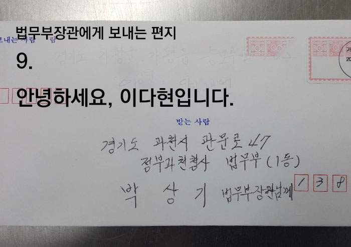 | [법무부장관님께] 11. 안녕하세요, 전예진입니다. (0) | 2019.04.18 |