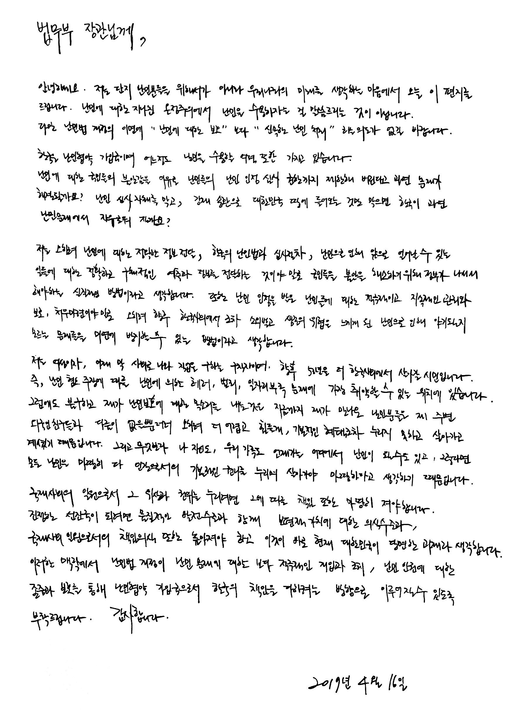 | [법무부장관님께] 8. 안녕하세요, 김윤정입니다. (0) | 2019.04.15 |
