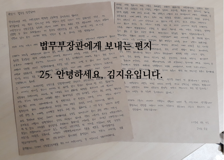 | [법무부장관님께] 26. 안녕하세요, 임한주입니다. (0) | 2019.05.07 |