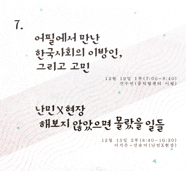 더 하는 말_지난 시간에 이어 한국사회에 의미있게 등장하고 있는 '난민인권운동'(들)에 대한 발표를 듣고, 함께 고민해보는 자리를 마련해보았습니다. 1부는 제도운동을 하고 있는 공익법센터 어필의 전수연변호사님을 모시고 어필의 활동에 대한 이야기를 들어보고, 2부에서는 올한해 난민 관련 연구활동을 진행해오신 난민X현장의 이지은, 전솔비선생님을 모시고 난민X현장의 활동과 연구들에 관한 이야기를 들어보고자 합니다. 벌써 올해 마지막 포럼의 자리네요. 많은 참여부탁드립니다.