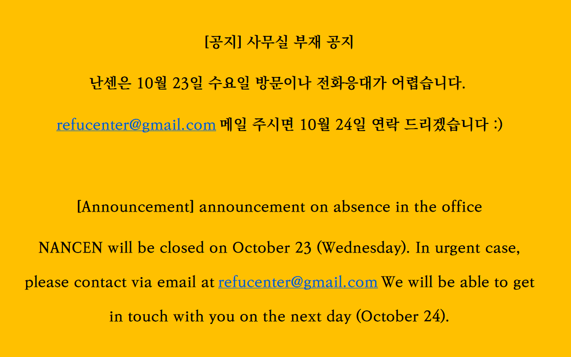 NANCEN will be closed on October 23 (Wednesday). In urgent case, please contact via email at refucenter@gmail.com We will be able to get in touch with you on the next day (October 24).