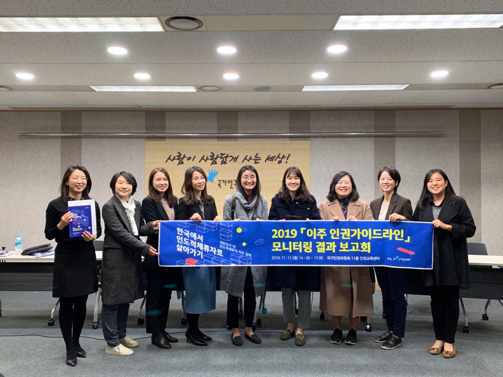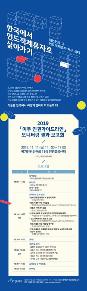 난민인권센터는 난민인권네트워크 내 난민처우 실무그룹(Working Group)에 참여하여 올해 인도적체류자 처우실태를 조사하고 그 결과를 보고서로 정리하였습니다. 모니터링 결과자료집 <한국에서 인도적체류자로 살아가기>를 공유합니다. 자료집: 국가인권위원회 홈페이지에 접속하여 다운받으실 수 있습니다. https://www.humanrights.go.kr/site/program/board/basicboard/view?menuid=001004001001&boardtypeid=9&boardid=7604832 동영상: 난민인권네트워크 페이스북 페이지에 접속하여 확인하실 수 있습니다 https://www.facebook.com/pg/KoreaRefugeeRightsNetwork/videos/ |