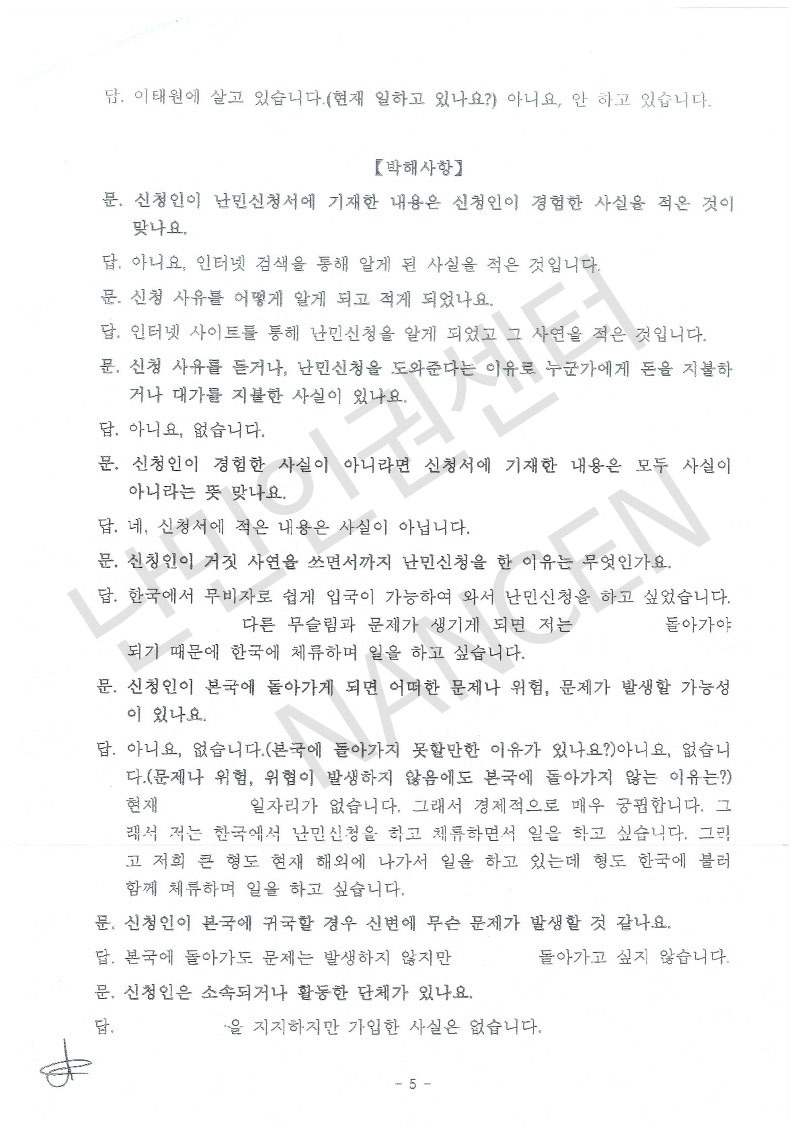 면접조서의 조작은 심각한 수준이었다. 피해자들의 면접조서에는 거의 찍어낸 수준으로 동일하게 다음과 같은 취지로 적혀있었다. “신청인이 난민신청서에 기재한 내용은 신청인이 경험한 사실을 적은 것이 맞나요?” “아니요, 인터넷 검색을 통해 알게 된 사실을 적은 것입니다.” “신청인이 신청서에 기재한 내용은 사실인가요?”, “아니요 사실이 아닙니다.”, “신청인이 난민신청을 한 이유는 무엇인가요?”, “한국에 체류하며 일을 하고 싶습니다.”, “신청인이 본국에 돌아가게 되면 어떠한 문제나 위험이 발생할 가능성이 있나요?”, “아니요 없습니다.” 이렇게 심각하게 왜곡된 면접조사를 통해 피해자들은 “한국에서 돈을 벌 목적으로 난민신청을 하였기 때문에 난민으로 인정하지 않는다”고 한국어로 적힌 난민불인정결정서를 받았다.