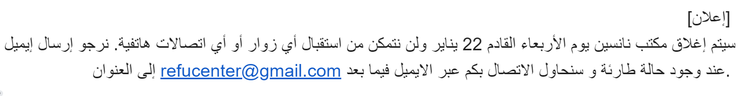 NANCEN will be closed on January 22 (Wednesday). In urgent case, please contact via email at refucenter@gmail.com We will try to get in touch with you by email.