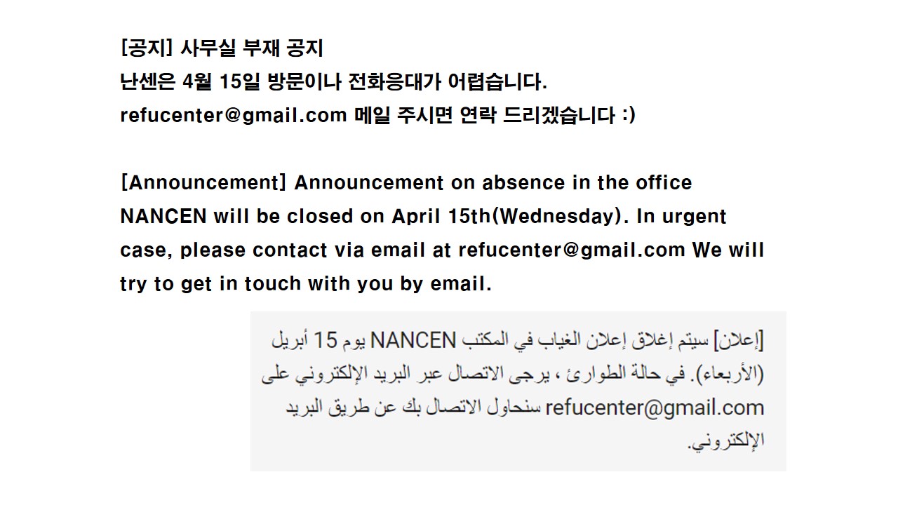 NANCEN will be closed on April 15th(Wednesday). In urgent case, please contact via email at refucenter@gmail.com We will try to get in touch with you by email.