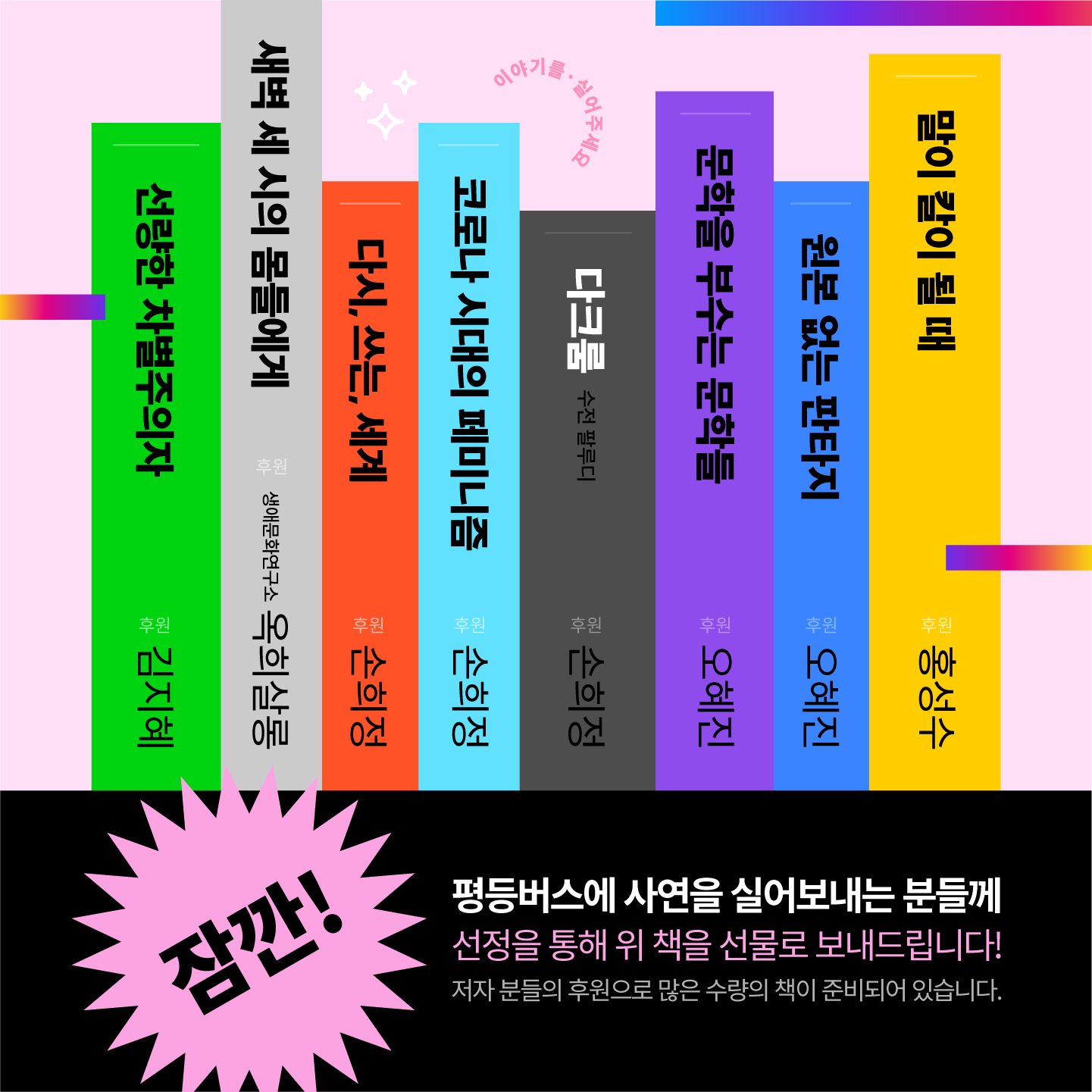 사연 선정을 통해 아래 책을 선물로 보내드립니다. 차별금지법을 지지하는 저자들의 후원으로 많은 수량의 책이 준비되어 있어요. (책을 기꺼이 후원해주신 저자분들께 다시 한 번 감사드립니다~!)