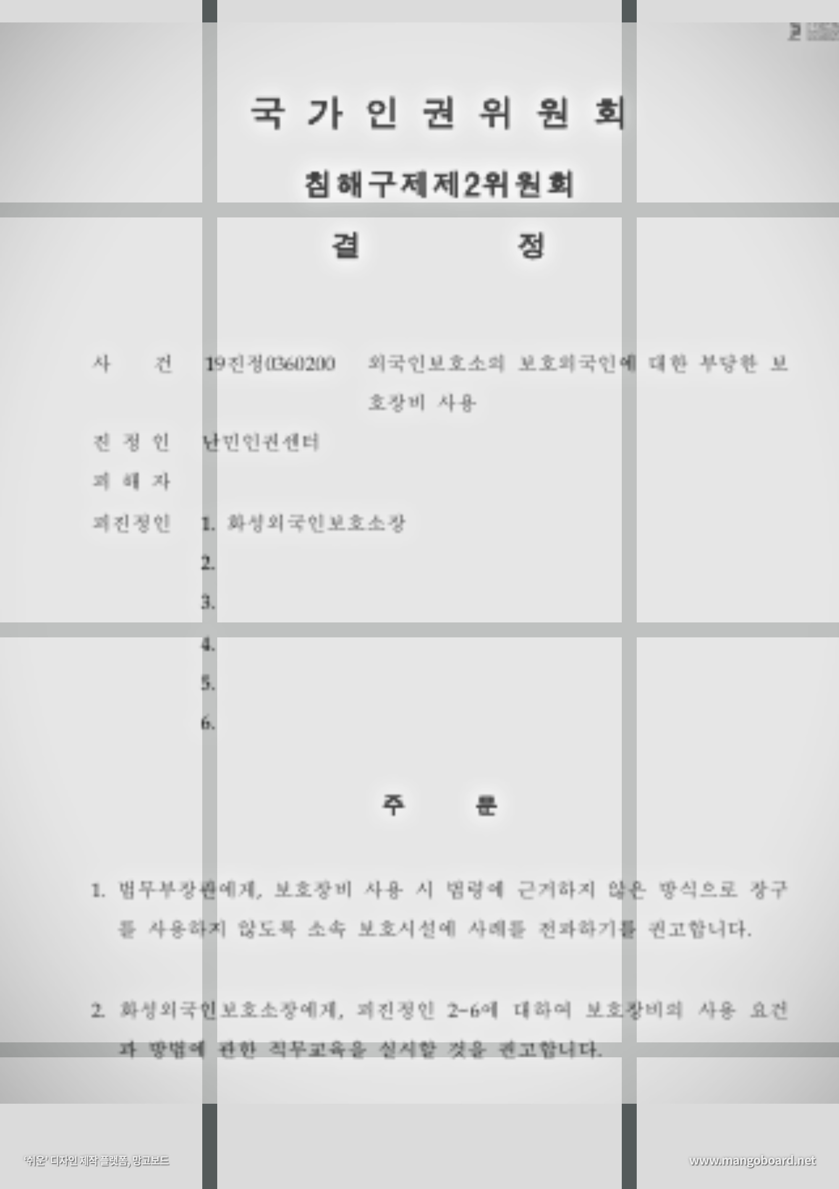 | 지난 2019년 4월 강제퇴거명령을 받아 외국인보호소에 수용되어 있던 난민 A는 외국인보호소 내 특별계호실(징벌방, 독방)에 갇혔습니다. 외국인보호소 질서유지 명목으로 이루어진 격리보호조치 과정에서 외국인보호소 공무원들은 난민 A에 대하여 수갑, 머리보호대, 발목수갑을 채웠고, A에 대해서 물리력을 행사하였습니다. 당시 A를 조력하고 있던 난센은 외국인보호소 공무원들이 보호외국인에 대한 폭행과 과도한 계구사용으로 A의 신체의 자유를 침해하였음을 이유로 국가인권위원회에 진정을 제기하였습니다. 그리고 지난 2020년 7월 14일 국가인권위원회는 법령에 근거하지 않은 계구 사용 및 과도한 계구 사용으로 인한 인권침해를 인정하면서, 법무부장관 및 화성외국인보호소장에 대하여 정책권고 결정을 내렸습니다(폭행 부분에 대해서는 인권침해를 인정하지 않고 기각하는 결정을 하였습니다). 국가인권위원회 결정문(국가인권위원회 사건 19진정0360200 외국인보호소의 보호외국인에 대한 부당한 보호장비 사용) 내용을 발췌하여 공유합니다. |