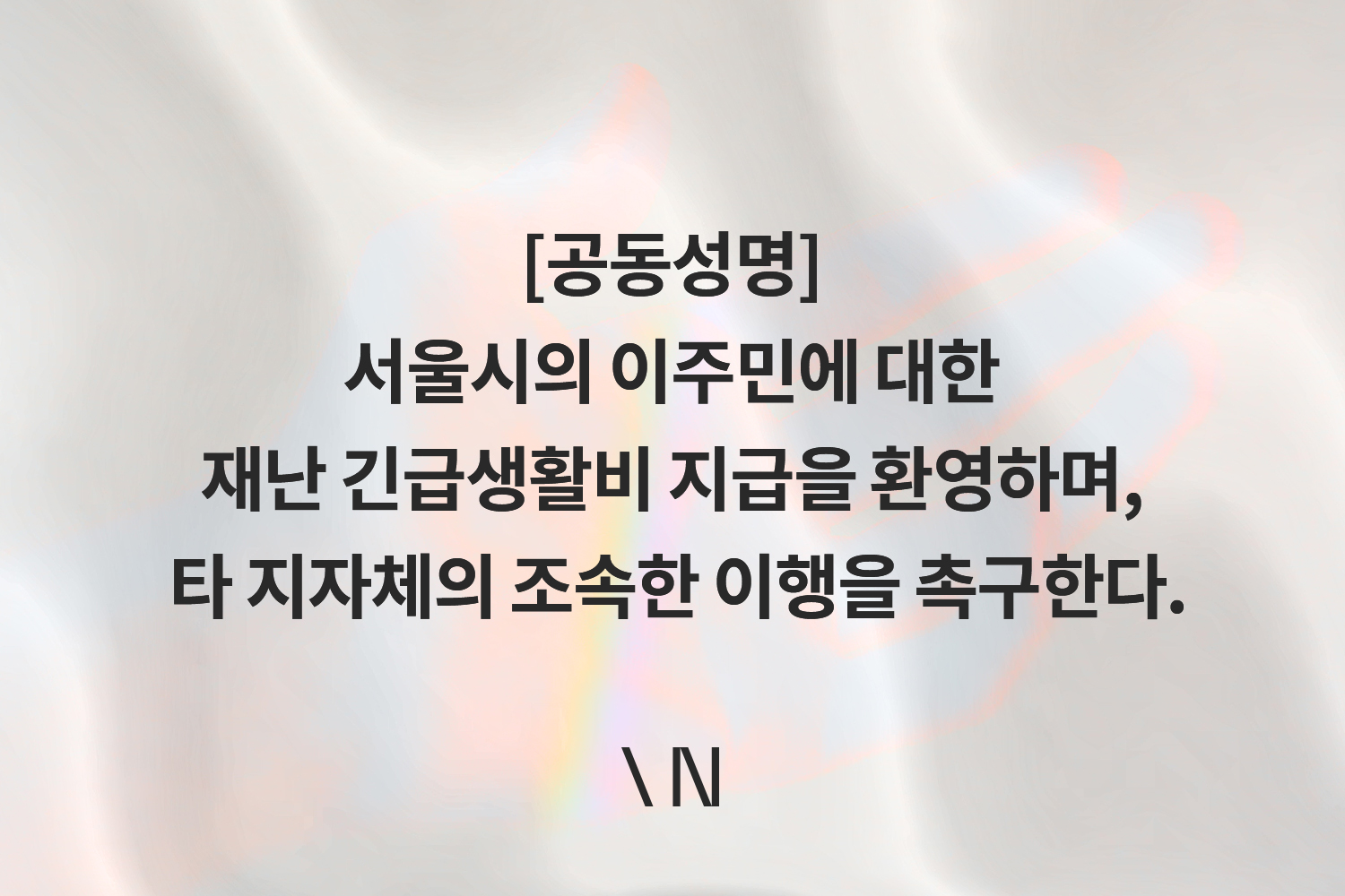 코로나19의 유행으로 인하여 경제적 위기에 몰린 주민들에게 생활의 안정 및 해당 지역의 경제 활성화를 목적으로 한 지원금을 지급하는 정책을 국적과 체류자격을 기준으로 차별적으로 적용하여서는 안된다. 서울시의 인권위 권고 수용 및 대책 마련을 환영하며, 경기도를 비롯한 타 지방자치단체, 나아가 국내 체류 외국인으로부터 많은 세금을 징수하고 있는 대한민국 정부 역시 재난지원금 정책을 평등하게 펼칠 것을 촉구한다.