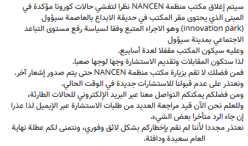 Le bureau de NANCEN s'est fermé en raison de l'épidémie de cas confirmés par corona au Seoul Innovation Park, où se trouve le bureau de NANCEN. Le bureau sera fermé pendant plusieurs semaines en raison du niveau accru de distance sociale dans la ville de Séoul. Il est donc difficile de se consulter en personne. Veuillez ne pas vous rendre au bureau de NANCEN avant la publication du nouvel avis. Nous nous excusons de ne pas pouvoir prendre une nouvelle consultation pendant un certain temps. Veuillez nous envoyer un e-mail pour les cas urgents. Cependant, nous avons beaucoup de courriels de consultation, veuillez donc noter que la réponse peut être retardée. Nous nous excusons de ne pas vous avoir donné la réponse appropriée et immédiate. Nous vous souhaitons une agréable et joyeuse période des Fêtes.