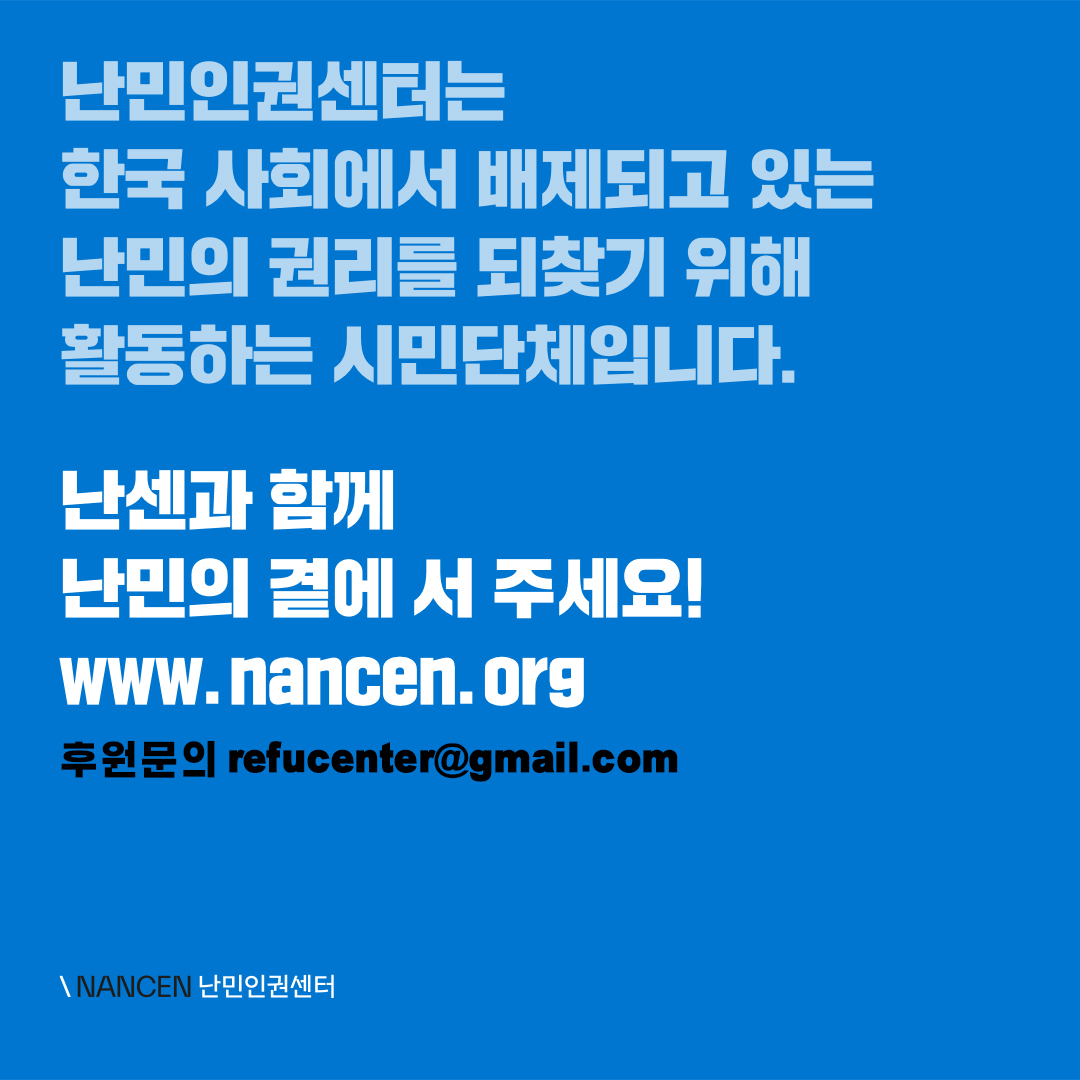 난민인권센터는 한국사회에서 배제되고 있는 난민의 권리를 되찾기 위해 활동하는 시민단체입니다.