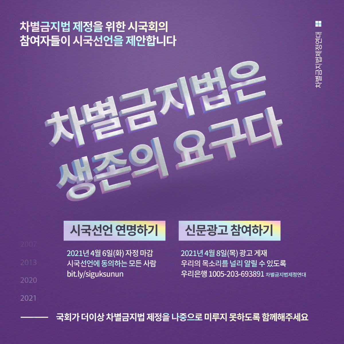 ■ 신문광고 참여 : 우리은행 1005-203-693891 차별금지법제정연대