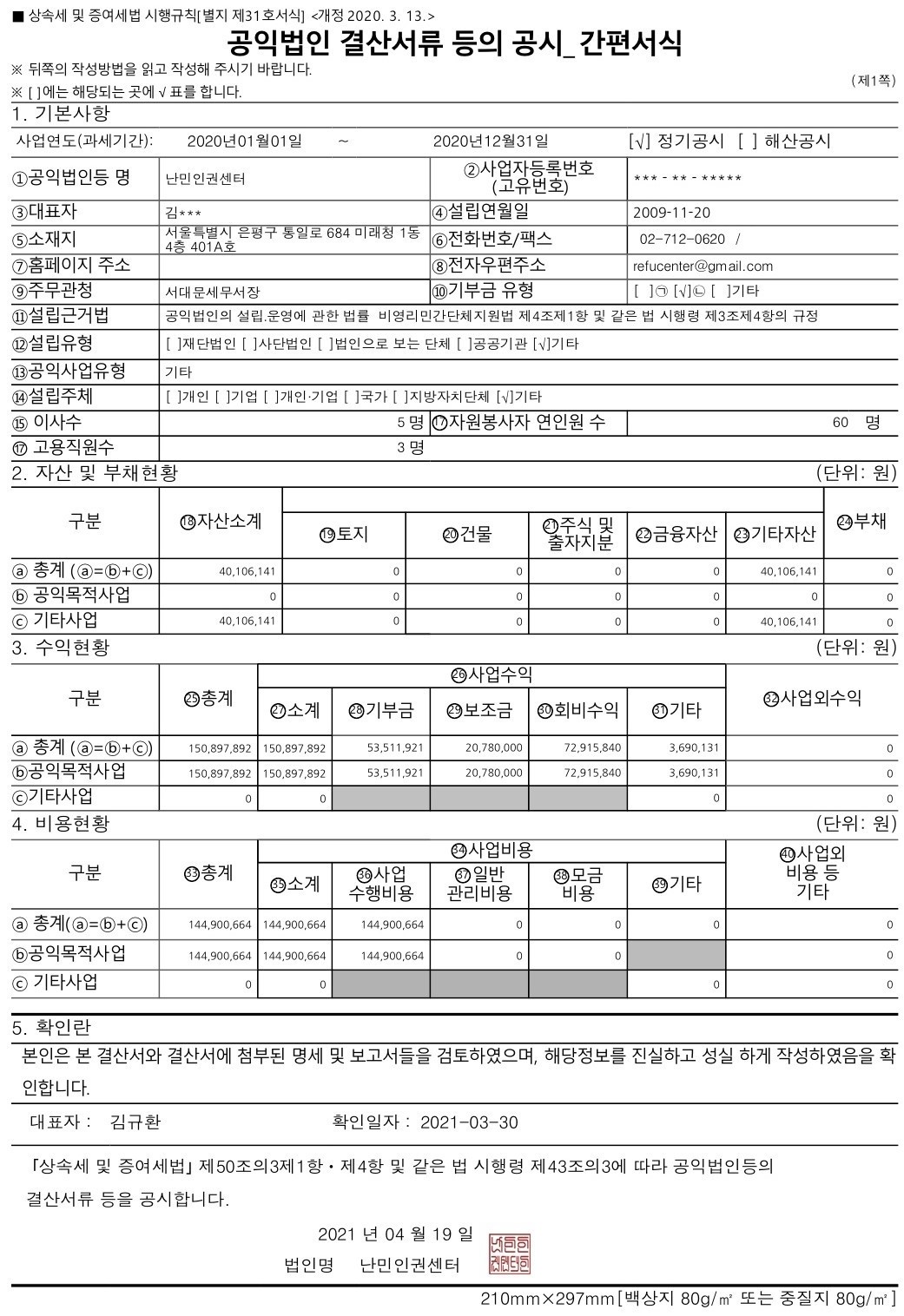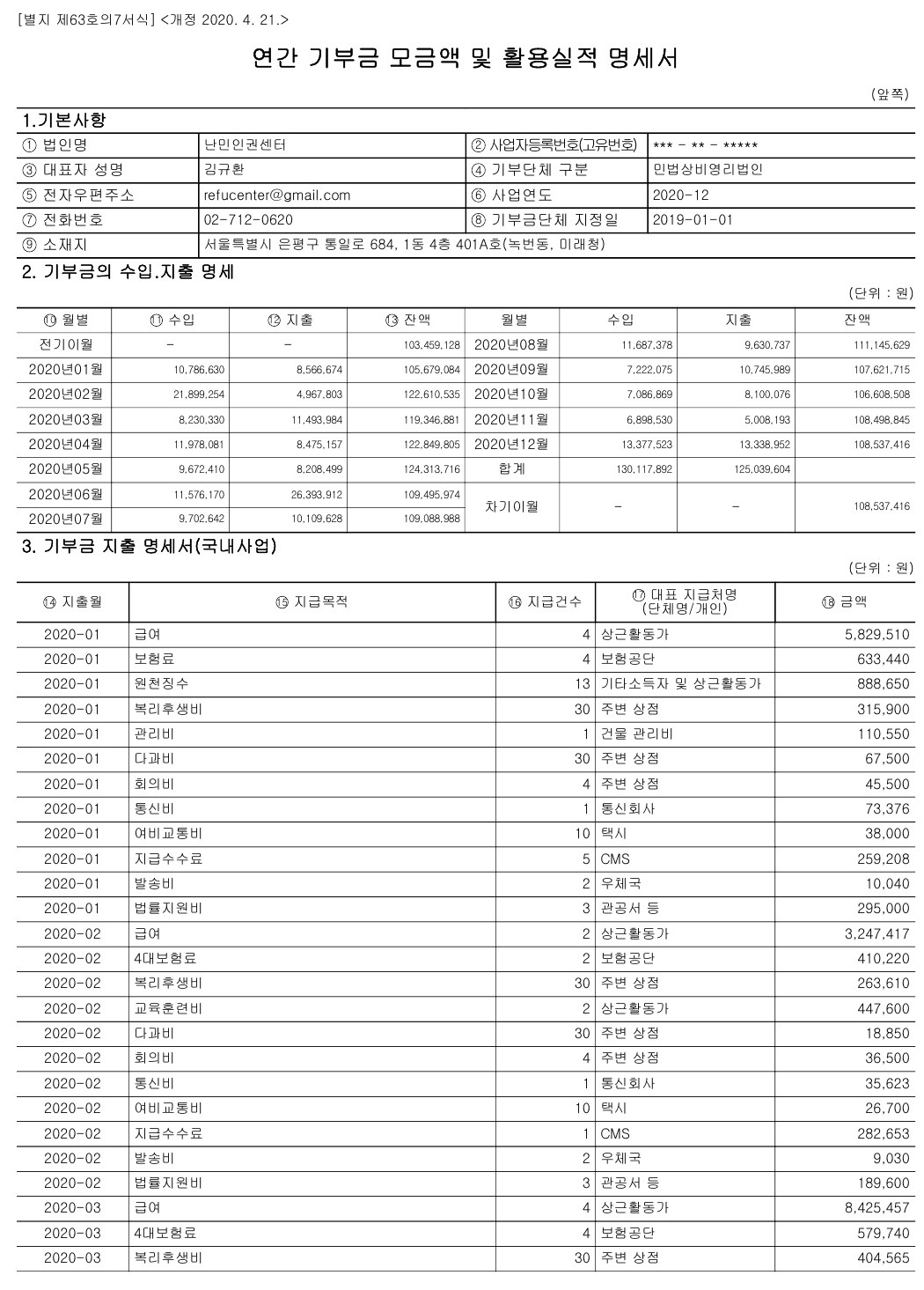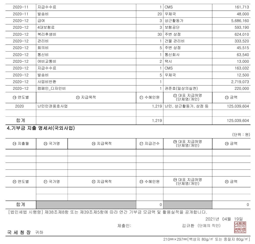 *난민인권센터의 2020년 공익법인 결산서류 등의 공시 및 기부금 활용실적 명세서를 '아래'와 같이 공유합니다. 본 내용은 국세청홈페이지(www.hometax.go.kr/)에서도 확인하실 수 있습니다.