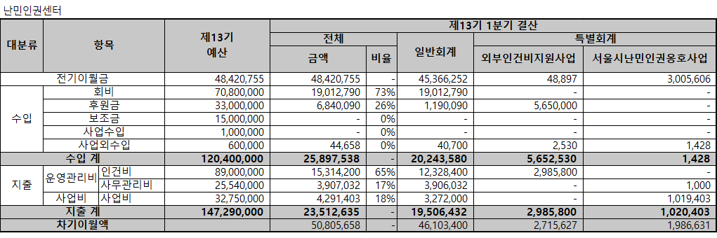 - 사업수입 : 서울시 <난민인권옹호사업>, 인권재단사람 공모사업에 선정되어 받은 사업비입니다.