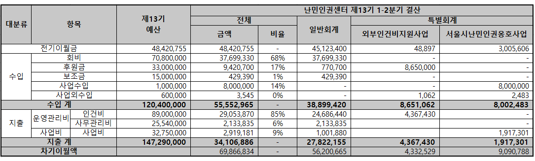 - 사업수입 : 서울시 <난민인권옹호사업>, 인권재단사람 공모사업에 선정되어 받은 사업비입니다.