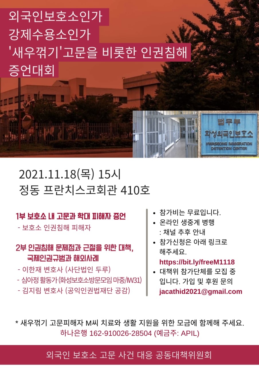 | [공동성명] 법무부는 외국인 ‘보호소’내 고문피해자 M님에 대해 즉각 보호해제 조치하라! (0) | 2021.11.12 |