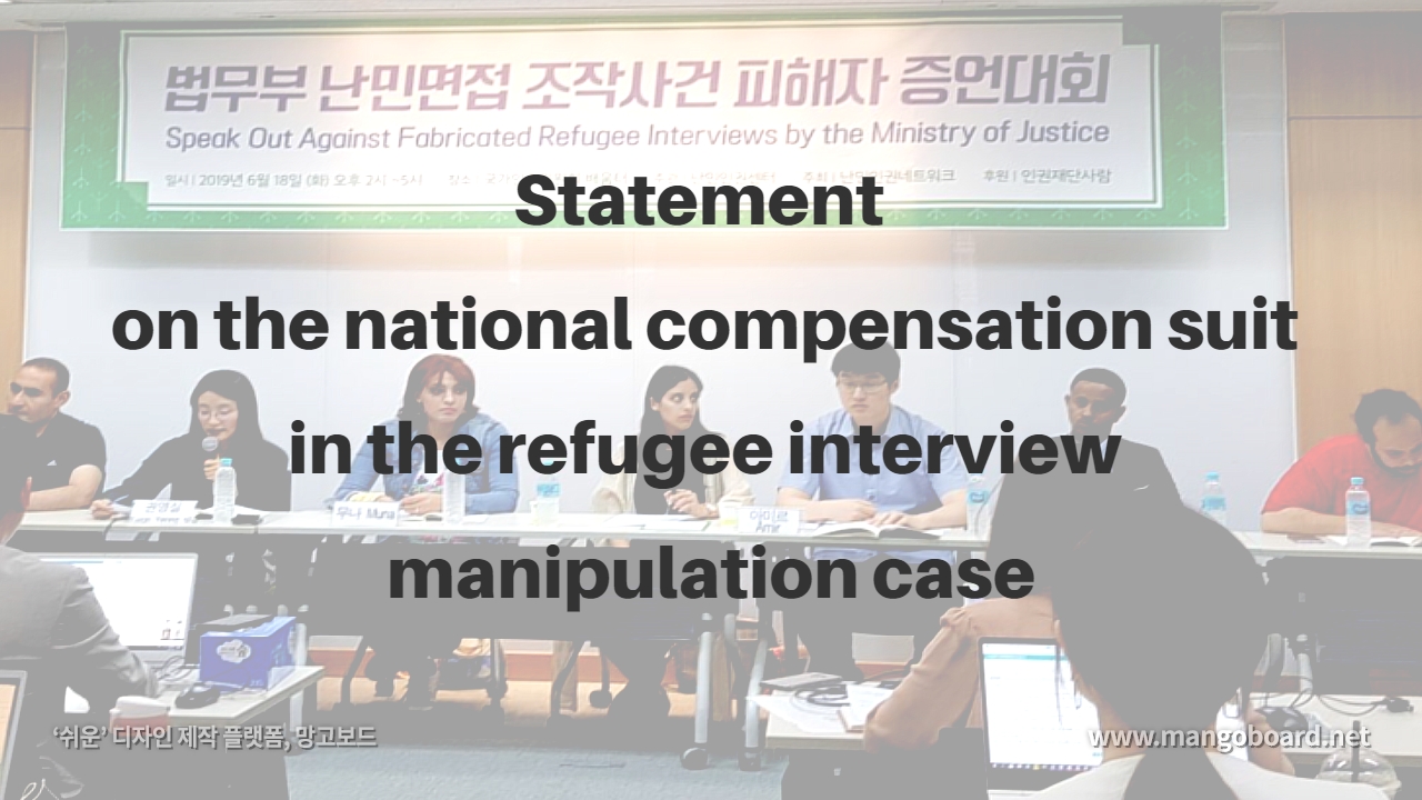 On December 3, the Seoul Central District Court judged the responsibility of refugee officials, interpreters, and the state in a national compensation suit filed by the victim of the September 2018 interview report manipulation case. Refugee officials and interpreters who participated in the manipulation of refugee interviews were liable for manipulation due to intention or gross negligence, and jointly recognized the state's liability for compensation. The Refugee Human Rights Network welcomes the court's ruling.