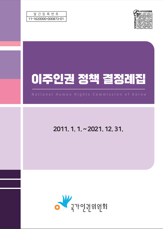 국가인권위원회에서 2011년부터 2021년까지 지난 10년간의 이주인권 정책 결정례(40건) 및 외국인 관련 인권침해,차별사건 중 주요 인용결정문(11건)을 모아 2022. 3. 21.자로 결정례집을 발간한 자료를 공유합니다.