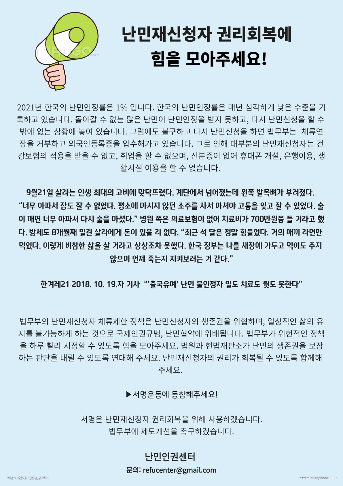 | 법무부는 난민재신청을 한 경우 유학생 또는 이주노동자로 1년 이상 체류한 경우, 하루라도 체류기간을 도과한 경우 등 난민신청을 억제하기 위하여 자의적 판단으로 유형화 한 일부 난민신청자에 대해 체류자격을 주지 않고 있습니다. 이로 인해 이들 대부분은 생계지원, 취업허가, 직장건강보험 가입이 법적으로 막히고, 신분을 증명할 서류조차 없어 휴대폰 개설, 은행이용, 생활시설 이용도 할 수 없습니다. 생존권이 위협받고, 정상적인 일상생활이 불가합니다. 난민인권센터는 난민재신청자의 권리회복을 요구합니다. 2022년 세계난민의 날, 국가인권위원회에서 난민재신청자의 기본적 생존을 보장하라는 의견표명(6월 17일)과 함께 국가인권위원장 성명이 발표되어 공유합니다. 세계난민의날…인권위 "난민재신청자 취업 금지 등 제약 안돼" “전화 두번 놓쳐 5년 기다리고, 또 5년을…난민심사 힘들어”[인터뷰] “한국에서 삶이 생겼는데”…난민 재신청자 사란이 애태우는 이유 |