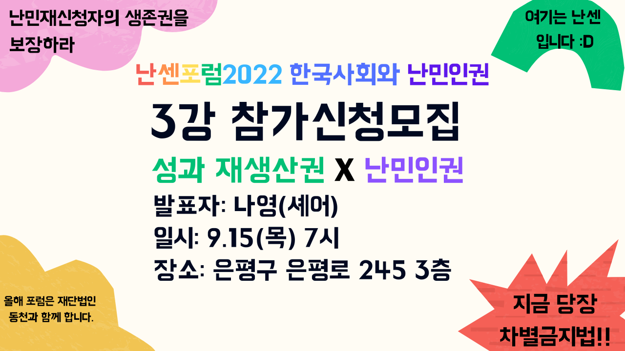 주제: '성적 권리와 재생산정의'의 관점에서 난민인권을 돌아보고, 앞으로 진행될 보다 많은 대화를 위한 대화를 나누는 자리입니다. 이주/난민 분야에서 활동하시는 동료활동가분들과 이 주제에 관심을 갖고 계신 모든 동료시민분들을 초대합니다. 함께 이야기 나눠요!
