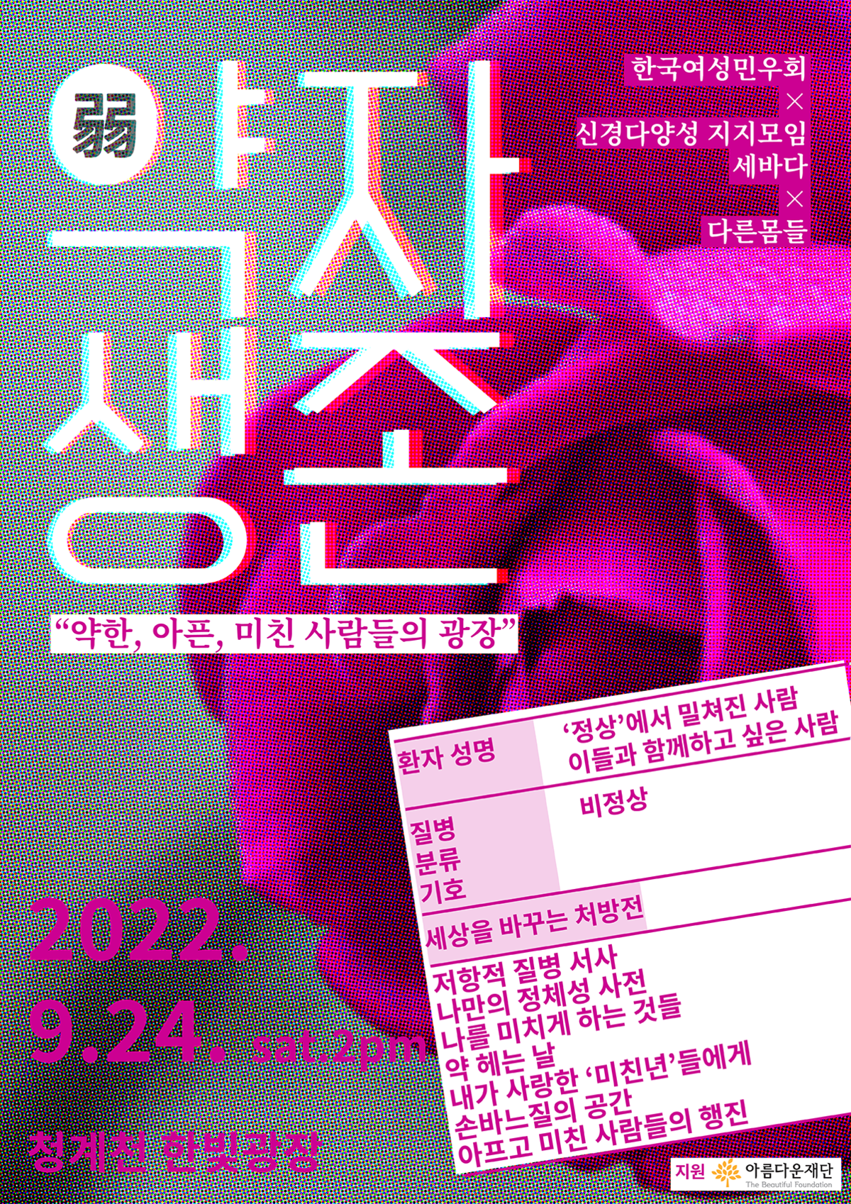 약자들이 모여 정상성에 저항하는 행사인 <약자생존>이 열린 지 딱 일주일이 되었습니다. 행사 일주일을 맞아 행사 현장 곳곳을 담은 사진을 공개합니다. 따뜻한 햇살과 알록달록한 바람개비가