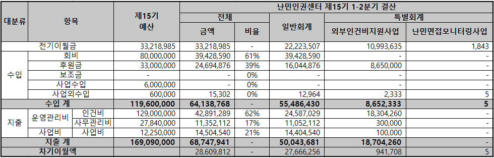 - 사업수입 : 난민인권옹호를 위한 캠페인, 포럼, 모니터링 등을 위해 지원받은 사업비입니다.