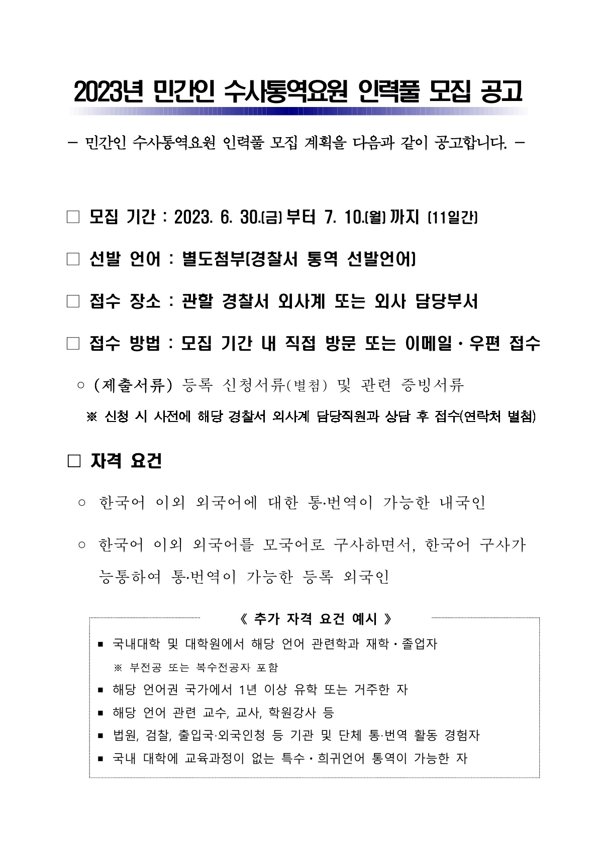 경찰청 '2023년 민간인 수사통역 인력풀 모집 공고'