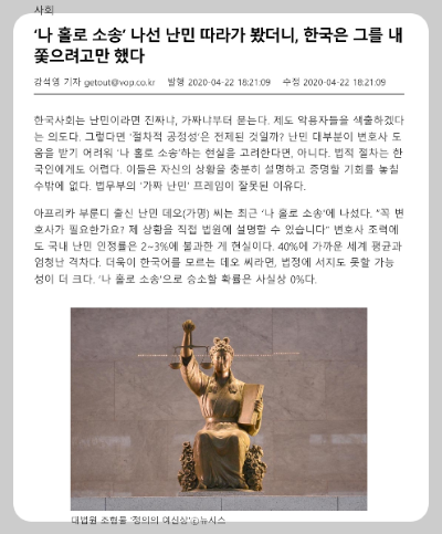 난민신청자의 재판 과정을 취재한 강석영 민중의 소리 기자는 “재판을 기다리던 중 ‘나 홀로 소송’하는 난민을 만났다. 변호사는 물론 시민단체 조력도 받지 못한 그는 정말 혼자였다. 자신의 차례가 됐다는 안내에도 그는 한국어를 모르는 탓에 하염없이 앉아만 있었다. 옆에 있던 두 사람이 아니었다면, 문 앞에 당사자를 두고 원고 없는 재판이 진행될 뻔했다.”고 당시 법정에서 목격한 상황을 기사로 전하며, “불친절한 절차는 난민소송 패소율을 높이는 원인 중 하나다.”라고 지적했다(민중의소리 2020. 4. 22. 자 기사 “‘나 홀로 소송’ 나선 난민 따라가 봤더니, 한국은 그를 내쫓으려고만 했다.”). 공식 통계에 대해서는 법원에서 보유하고 있지 않아 확인하기 어렵지만, 매년 손에 꼽을 수 있는 난민소송 승소 건 수 중 실제 변호사 조력을 받지 않고 ‘나 홀로 소송’을 하여 재판에서 승소한 사례는 아직까지도 찾아볼 수 없다. 사법통역이 당사자의 절차적 권리로서 보장되고 있지 않은 것이 중요한 원인이라고 지적해 볼 수 있겠다.