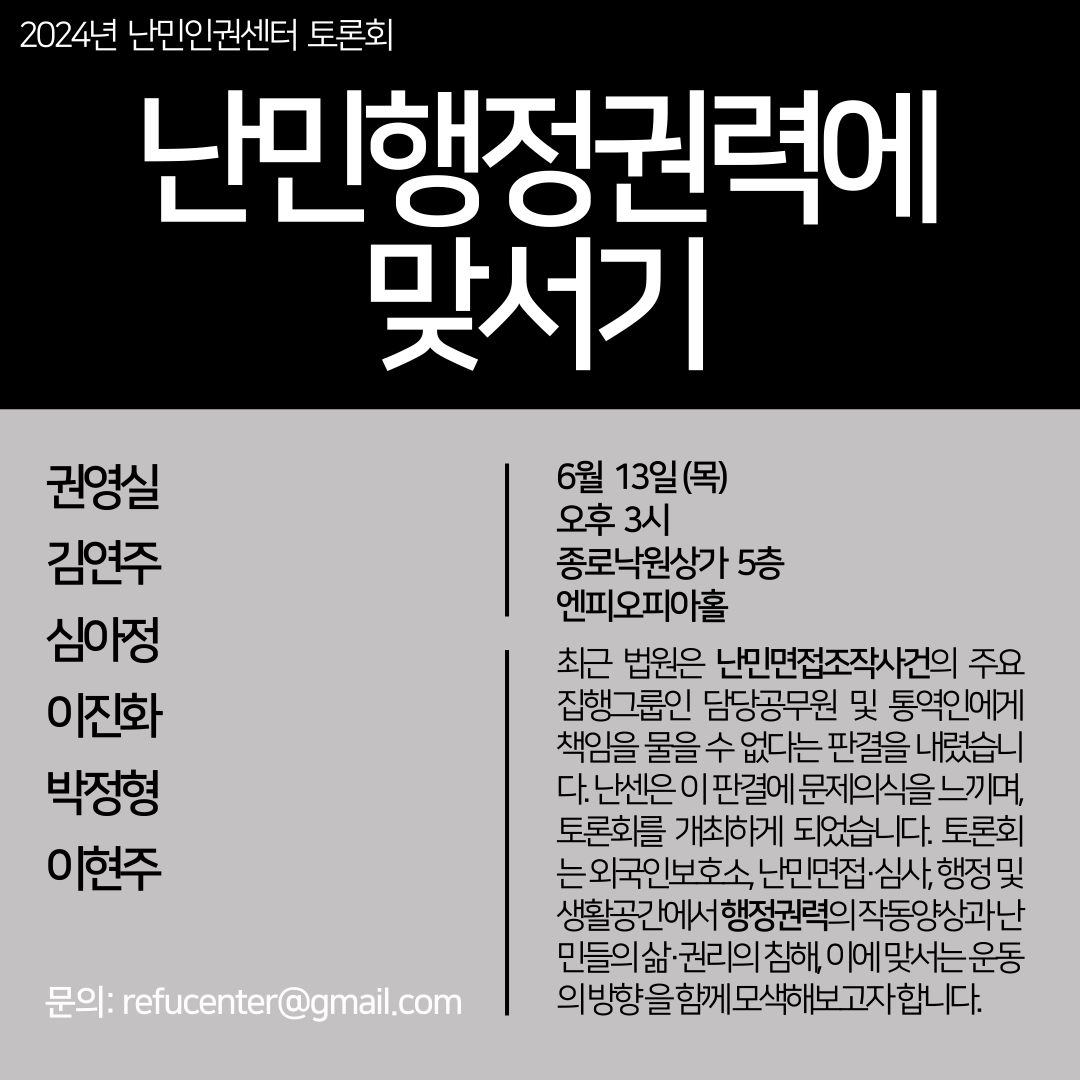 | [2024 세계난민의 날 공동성명] 난민 생계비 예산 삭감을 규탄한다 (0) | 2024.06.20 |