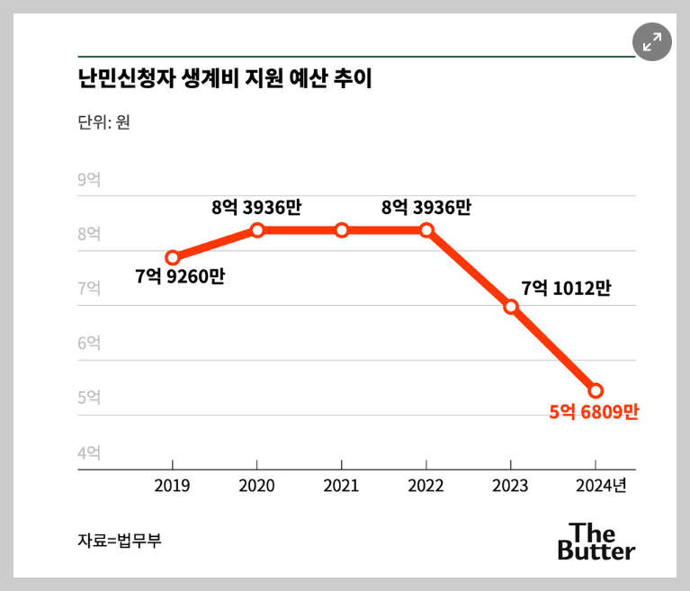 난민생계비지원제도는 난민신청자 생계지원에 관한 유일한 제도이다. 한국에서 난민심사를 받는 동안 경제적인 어려움을 겪는 난민신청자들이 많다는 것은 충분히 알려진 현실임에도 2024년 난민 생계비 예산은 20% 삭감되었다. 2024년 난민생계비 예산은 5억 6,809만 6천원으로 400명에게 약 43만원씩 3개월 간 지급할 수 있는 수준에 불과하다(The Butter, 2024. 6. 20 자 기사, "일 못하게 막으면서 생계비 예산 삭감이라니"... 난민신청자들 시름").