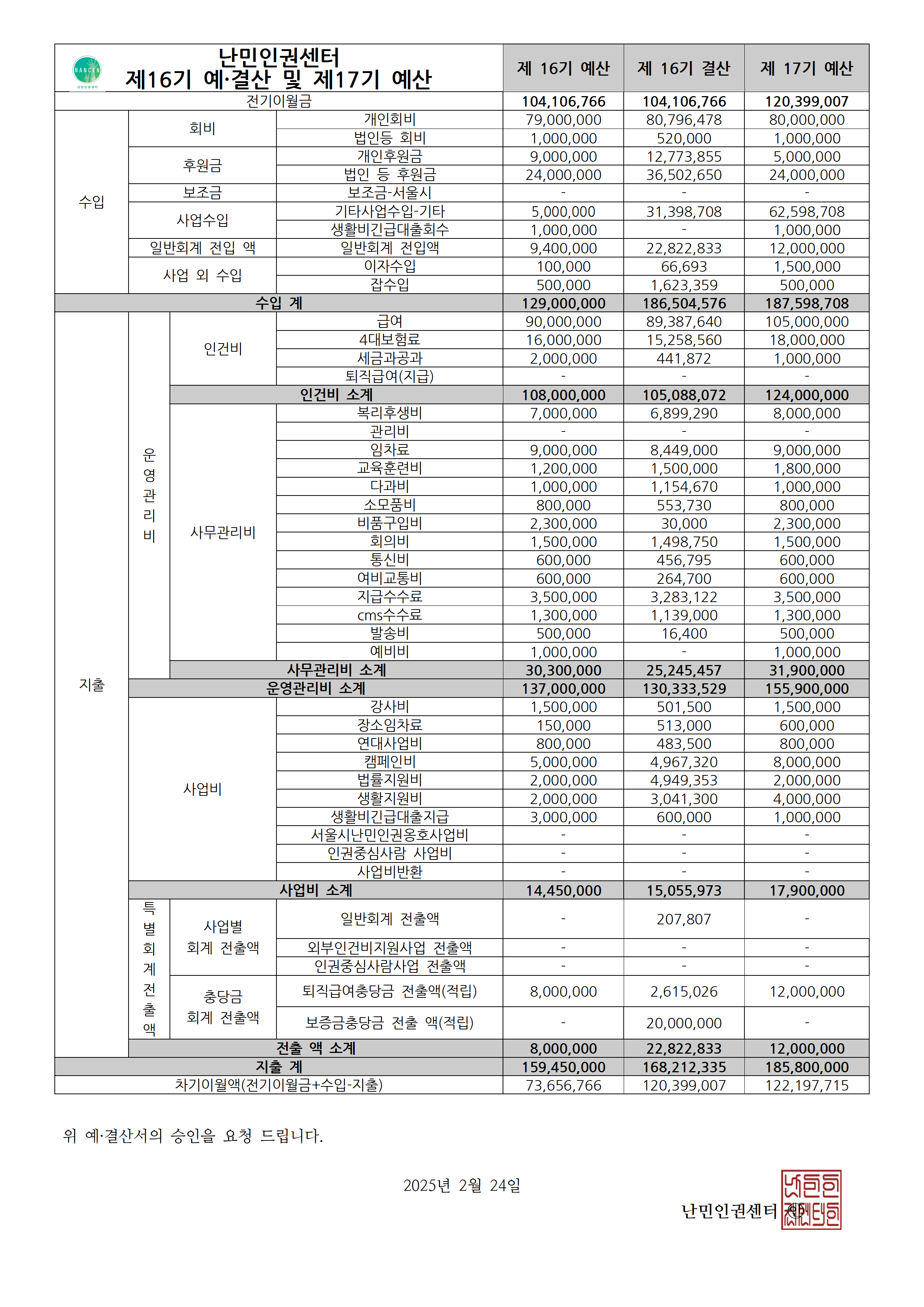 *2025년(제17기) 예산은 총회 의견에 따라 조정될 수 있습니다.