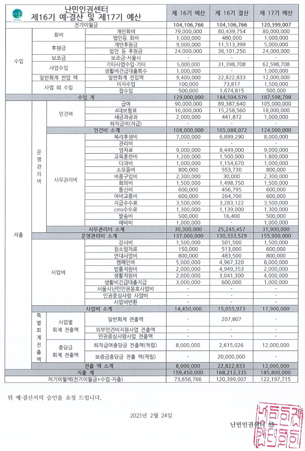 2024년(제16기) 결산 및 2025년(제17기) 예산