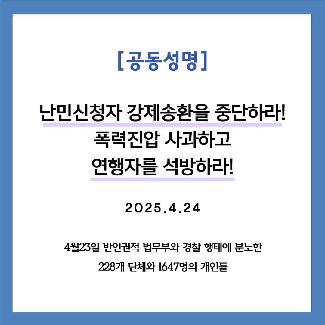 | 2025.4.25 이주민 강제송환에 관한 법무부 보도자료에 대한 입장문 (0) | 2025.05.01 |
