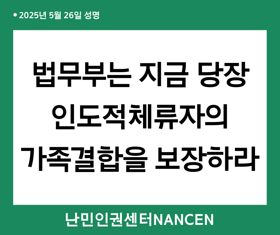 국가인권위원회는 2024년 10월 15일에 법무부장관에게 인도적체류자의 가족결합이 가능하도록 난민법 개정을 추진할 것을 권고했으나 법무부가 해당 권고를 수용하지 않겠다는 입장을 회신했다고 밝혔다(2025.05.26. 인권침해조사과 보도자료 "인도적체류자 가족결합권 보장 권고, 법무부 불수용") 인도적체류자의 기본적 권리를 침해하고, 가족을 만나고 싶은 이들의 절실한 목소리를 외면하는 법무부를 규탄한다.