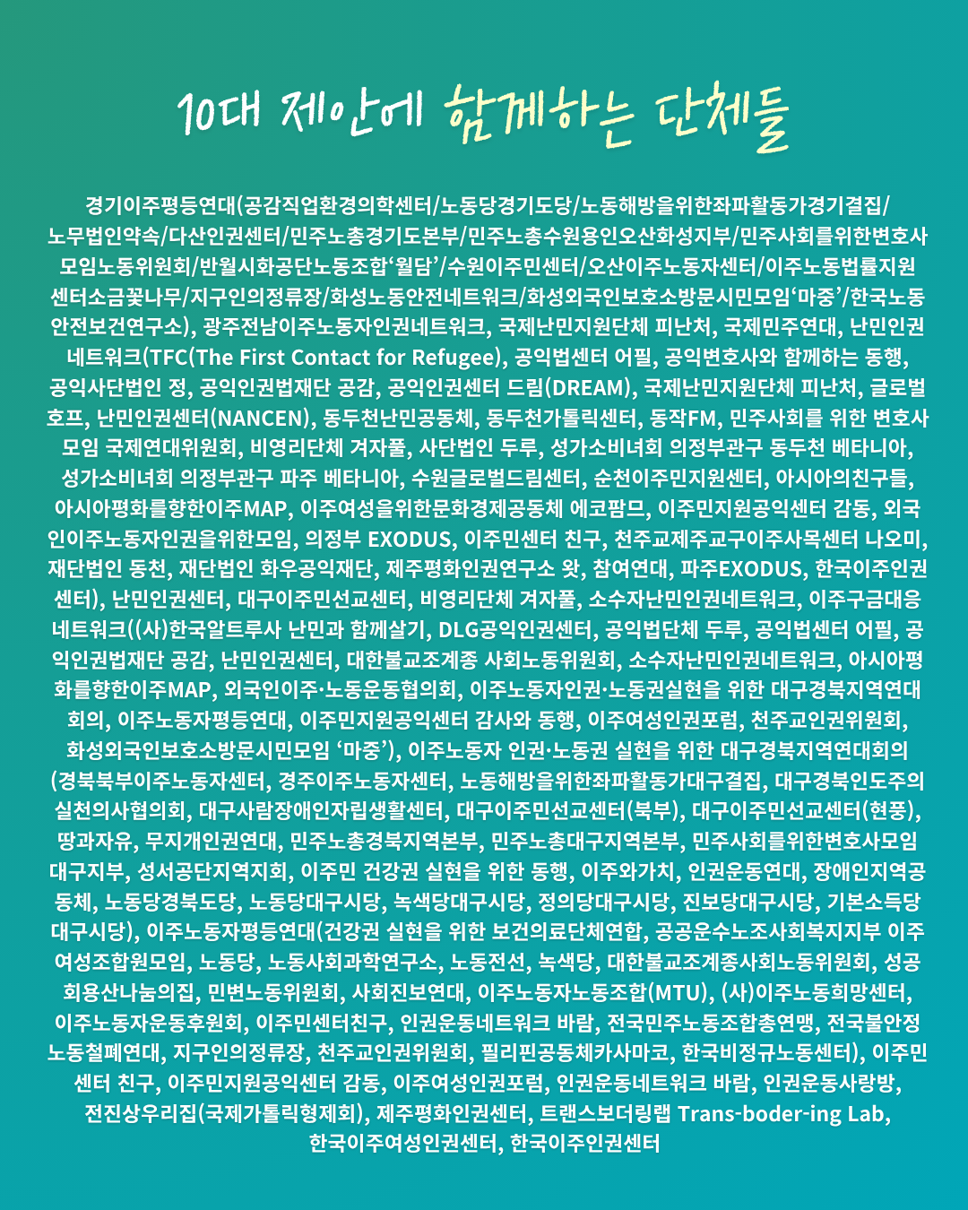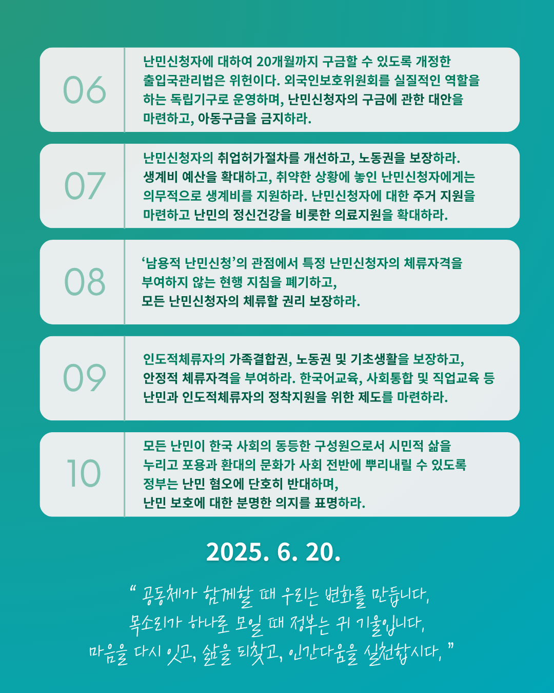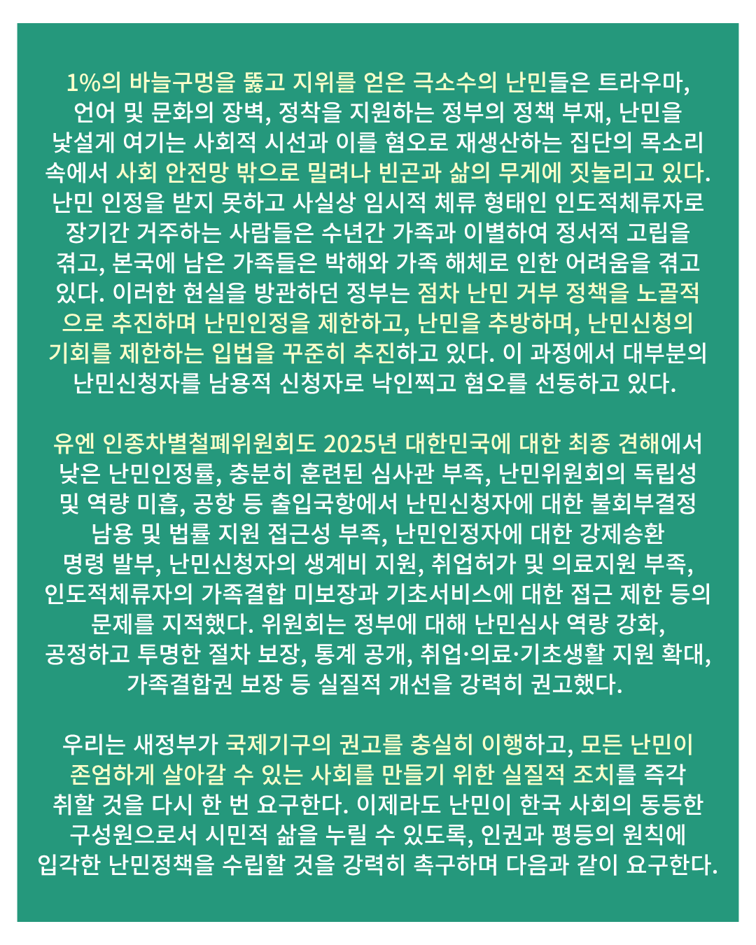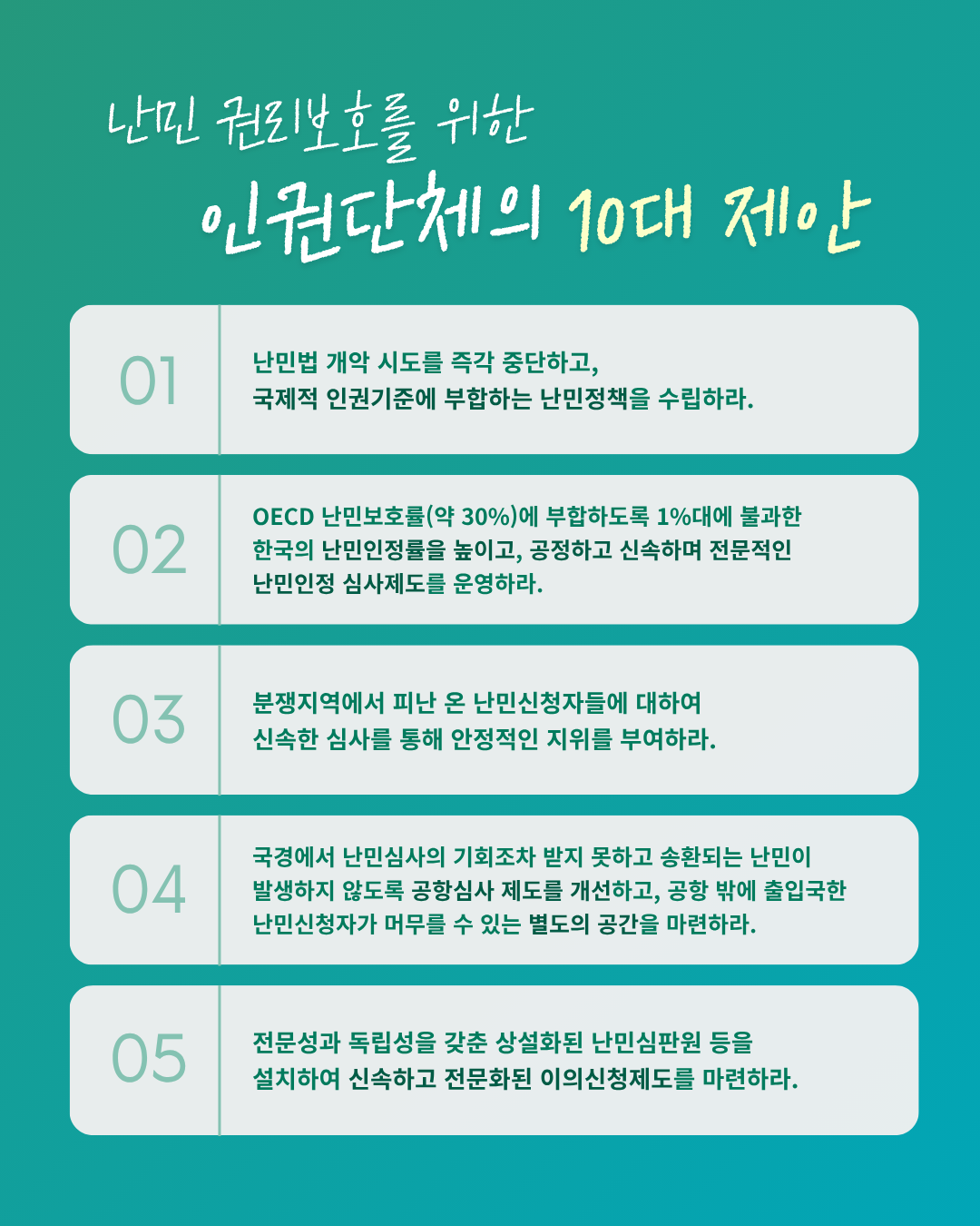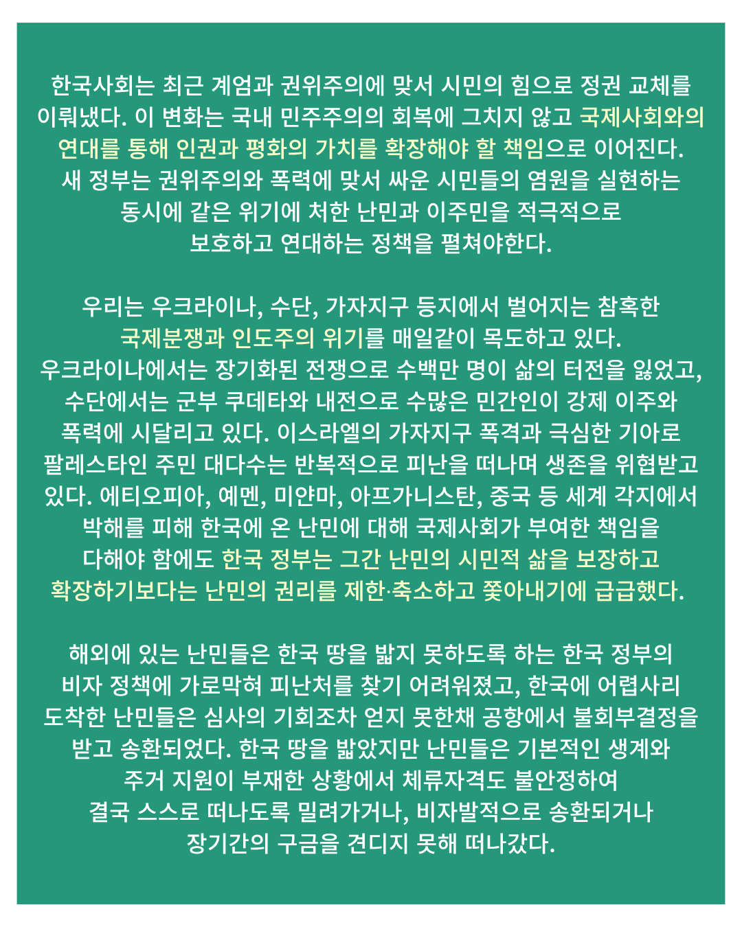 새정부에 요구한다 난민 권리보호를 위한 인권단체의 10대 제안 한국사회는 최근 계엄과 권위주의에 맞서 시민의 힘으로 정권 교체를 이뤄냈다. 이 변화는 국내 민주주의의 회복에 그치지 않고