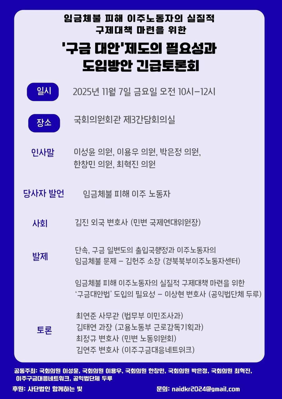 | 임금체불 피해 이주노동자의 실질적 구제대책 마련을 위한 '구금 대안'제도의 필요성과 도입방안 긴급토론회 (0) | 2025.11.10 |
