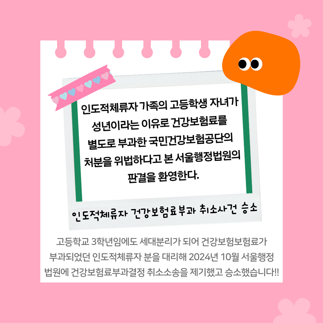 | [성명] 인도적체류자 가족의 고등학생 자녀가 성년이라는 이유로 건강보험료를 별도로 부과한 국민건강보험공단의 처분을 위법하다고 본 서울행정법원의 판결을 환영한다 (0) | 2025.11.14 |