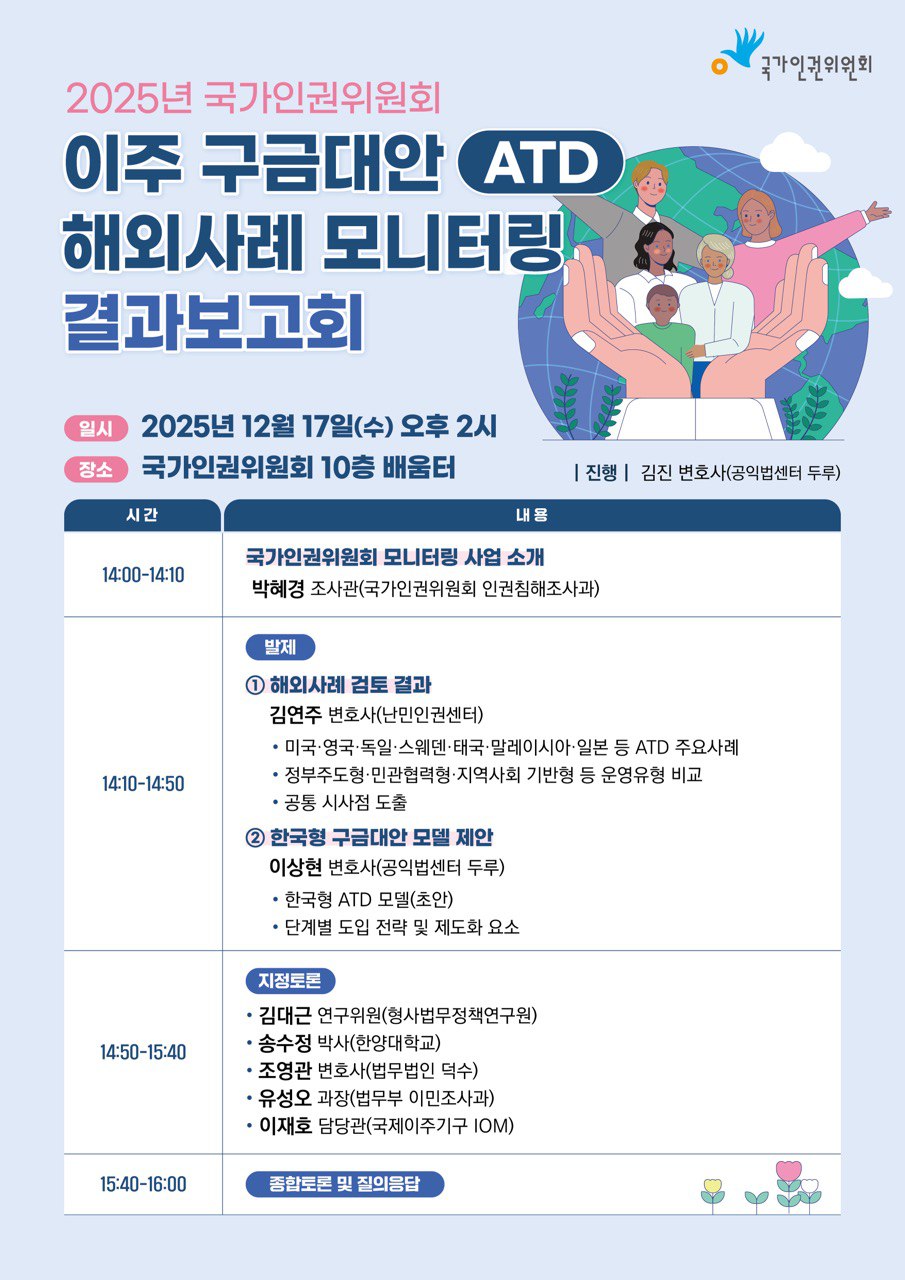 | 난민인권센터는 이주구금대응네트워크 활동의 일환으로 2025년 국가인권위원회 이주구금대안 해외사례 모니터링에 참여하였습니다. 2025년 12월 18일 결과보고회를 진행하였고, 자료집을 공유드립니다. |