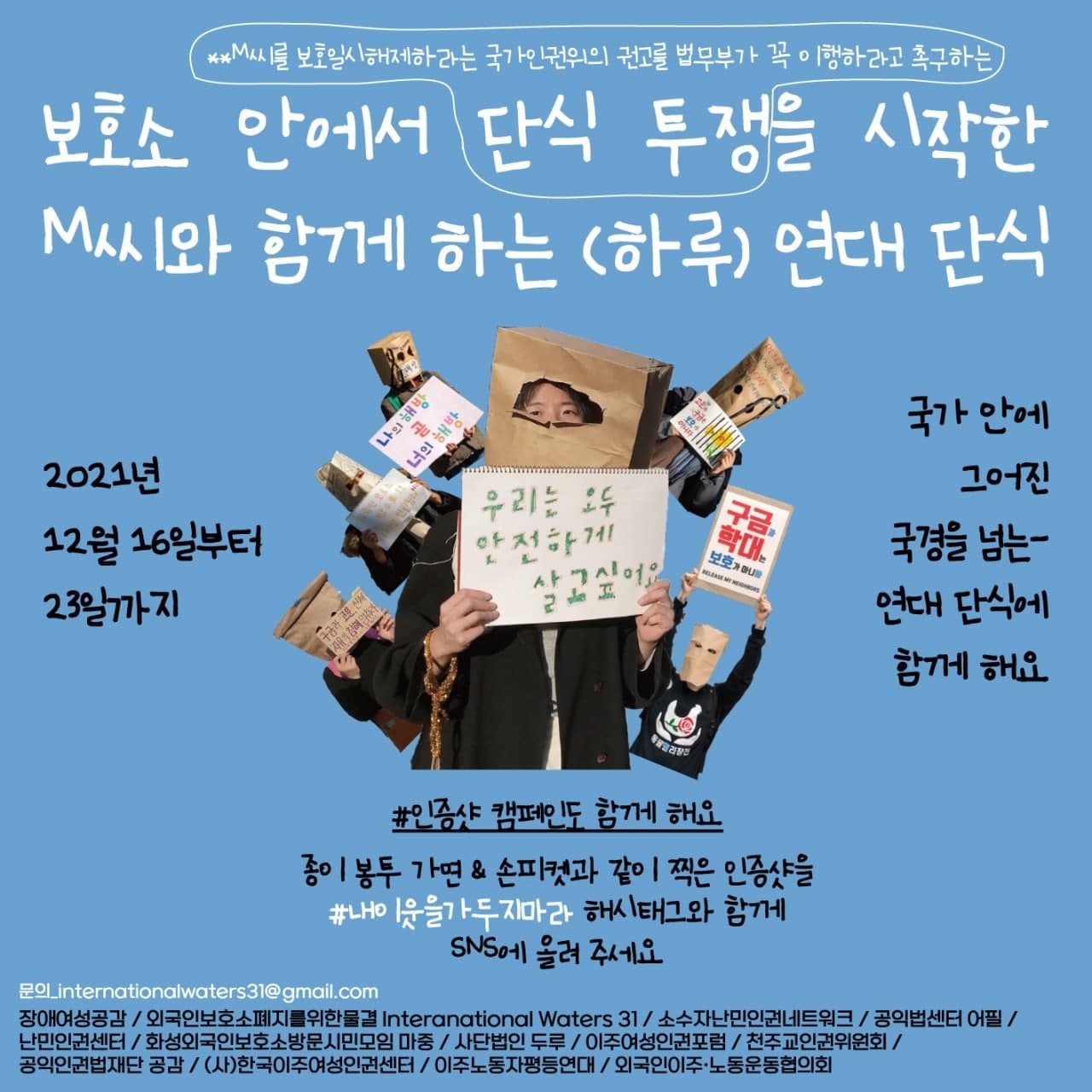 장애여성공감, 외국인보호소폐지를위한물결 International Waters31, 소수자난민인권네트워크, 화성외국인보호소방문시민모임 <마중>, 사단법인 두루, 난민인권센터, 다산인권센터, 이주여성인권포럼, 이주민과 함께, 공익인권법재단 공감, AFI온누리 사회사도직, 한국이주인권센터, 생각나무BB센터, 외국인이주•노동운동협의회((사)모두를 위한 이주인권문화센터, 아산이주노동자센터, 부천이주노동복지센터, 인천외국인노동자센터, (사)한국이주민건강협회 희망의친구들, 남양주시외국인복지센터, 성공회파주이주노동자센터 샬롬의집, 포천나눔의집, 서울외국인노동자센터, 아시아인권문화연대, 순천이주민지원센터, 외국인이주노동자인권을위한모임, 의정부EXODUS, (사)함께 하는 공동체, (사)한국이주여성인권센터, 원불교 서울외국인센터, 한삶의집, 이주민센터 동행, 이주노동자평등연대(건강권 실현을 위한 보건의료단체연합 (건강권 실현을 위한 행동하는 간호사회, 건강사회를 위한 약사회, 건강사회를 위한 치과의사회, 노동건강연대, 인도주의실천의사협의회, 참의료실현청년한의사회) , 노동당, 노동사회과학연구소, 노동전선, 녹색당, 대한불교조계종사회노동위원회, 성공회 용산나눔의집, 민변노동위원회, 사회변혁노동자당, 사회진보연대, 이주노동자노동조합(MTU), (사)이주노동희망센터, 이주노동자운동후원회, 이주민방송(MWTV), 이주민센터 친구, 전국민주노동조합총연맹, 전국불안정노동철폐연대,